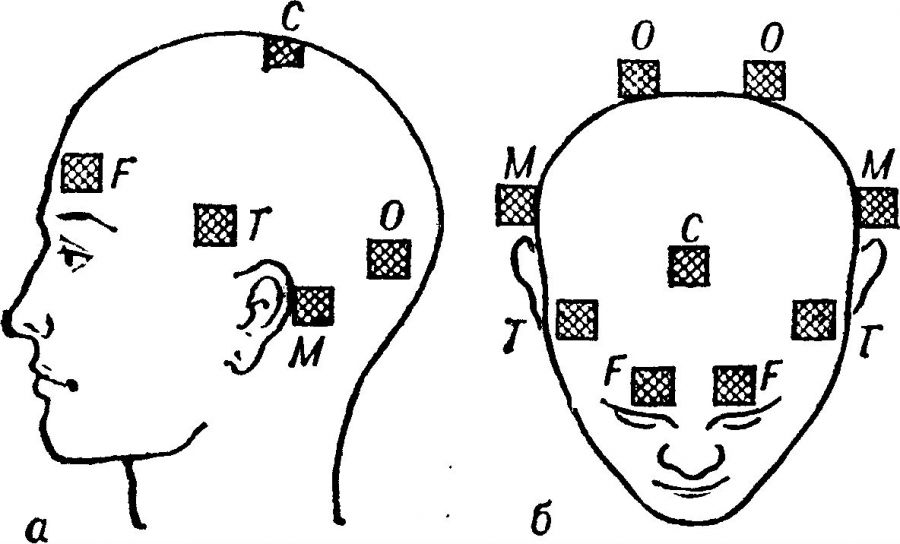 - наружную сонную артерию электрические проводники накладываются над бровями снаружи и спереди от наружного ушного отверстия;