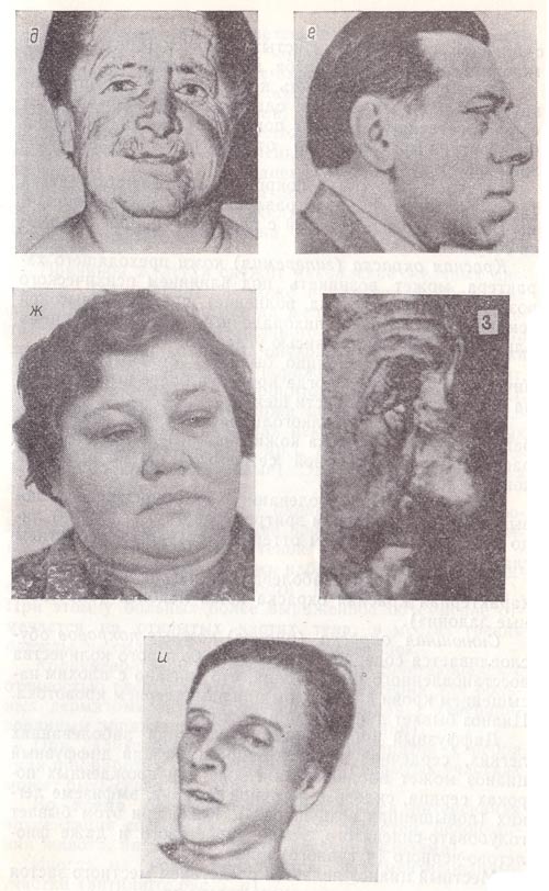 Гемиатрофия лица характеризуется постепенно нарастающей атрофией одной (чаще левой) половины лица. Вначале поражается какой-либо отдельный участок (нижняя челюсть, щека, глазничная область); прогрессируя, процесс захватывает всю половину лица, а в отдельных случаях и всю одноименную или противоположную половину тела. Кожа резко истончается, становится сухой (нарушается функция сальных желез), похожей на пергамент, депигментируется (но нередко становится желто-бурой или коричневой), нарушается нормальная работа потовых желез (гипер- или гипогидроз), прекращается рост волос, ресницы выпадают; атрофируются подкожный жировой слой и кости, отмечается раннее выпадение зубов. С развитием процесса лицо приобретает характерный вид: оно становится асимметричным, глазное яблоко западает, половина носа уменьшается, ушная раковина становится как бы сморщенной. Некоторые больные жалуются на боли в соответствующей половине лица. У ряда больных гемиатрофия сочетается со склеродермией (см.). Этиология и патогенез гемиатрофии лица не выяснены. Подавляющее большинство авторов связывает это заболевание с поражением соответствующих отделов вегетативной нервной системы. Эффективных методов лечения не существует. В далеко зашедших случаях для выпячивания глубоко запавшей щеки применяют специальные пластмассовые протезы.